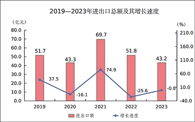全年全市海關進出口總額43.2億元,比上年下降0.8%。其中,出口額38.7億元,增長24.2%;進口額4.5億元,下降63.7%。