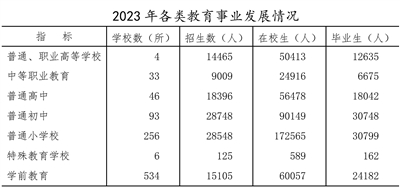 全市普通、職業高等學校4所,中等職業教育學校33所,普通高中46所,普通初中93所,普通小學256所,特殊教育6所,學前教育534所。