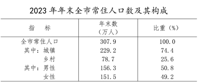 據2023年人口抽樣調查,年末全市常住人口為307.9萬人,比上年末減少2.2萬人。其中,城鎮常住人口229.2萬人,占常住人口比重為74.4%,比上年末提高0.7個百分點。全年全市出生人口1.7萬人,人口出生率為5.6‰;死亡人口2.6萬人,死亡率為8.3‰;自然增長率為-2.7‰。