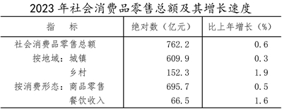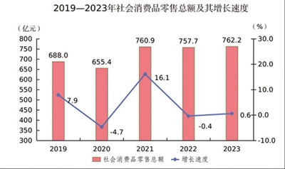 全年全市社會消費品零售總額762.2億元,比上年增長0.6%。按經營地統計,城鎮消費品零售額609.9億元,增長0.3%;鄉村消費品零售額152.3億元,增長1.9%。按消費類型統計,商品零售額695.7億元,增長0.5%;餐飲收入額66.5億元,增長1.6%。